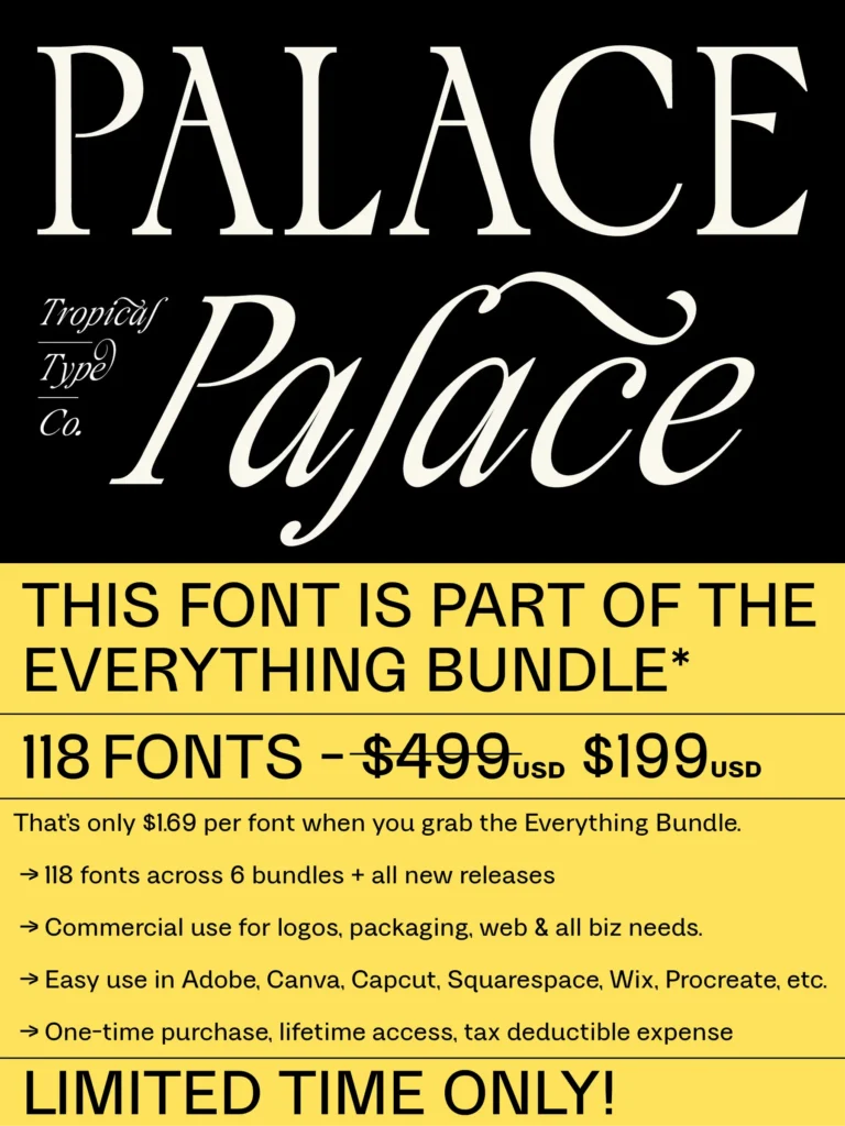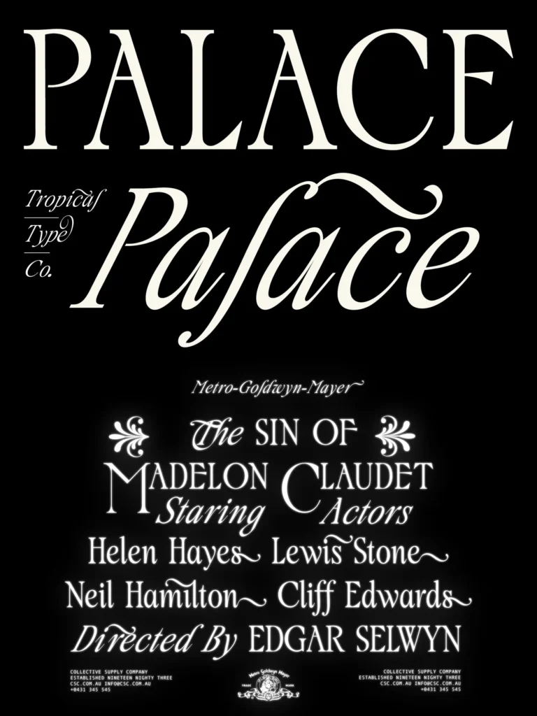 Palace is a classical serif loaded with flourishes and alternates for a chic vintage feel.
