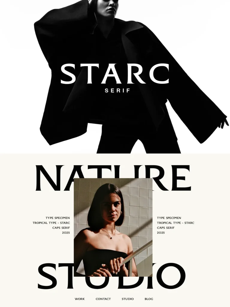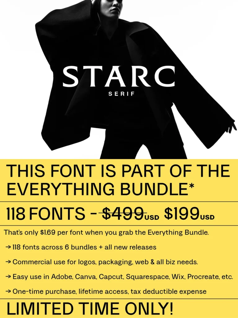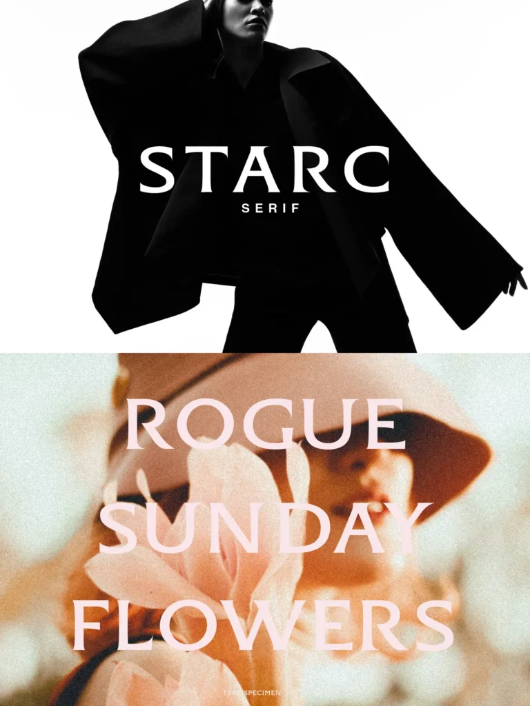 Starc Serif is bold and edgy, but in a distinguished way. Its low-contrast caps are mostly conservative, but each contains one sharp serif to add a subtle distinction to your typography. Perfect for fashion or