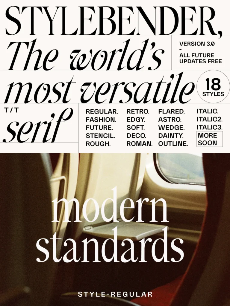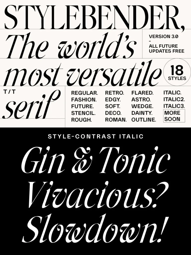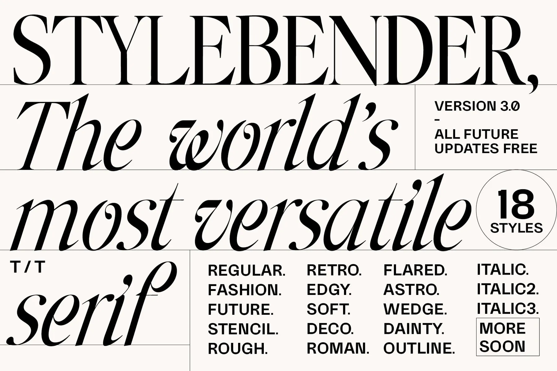 Stylebender may be the most versatile serif in type history! A theme and variation style font which works for everything from a heavy metal poster to a chic word-mark. From a Fashion magazine masthead to a farmers market tote-bag.